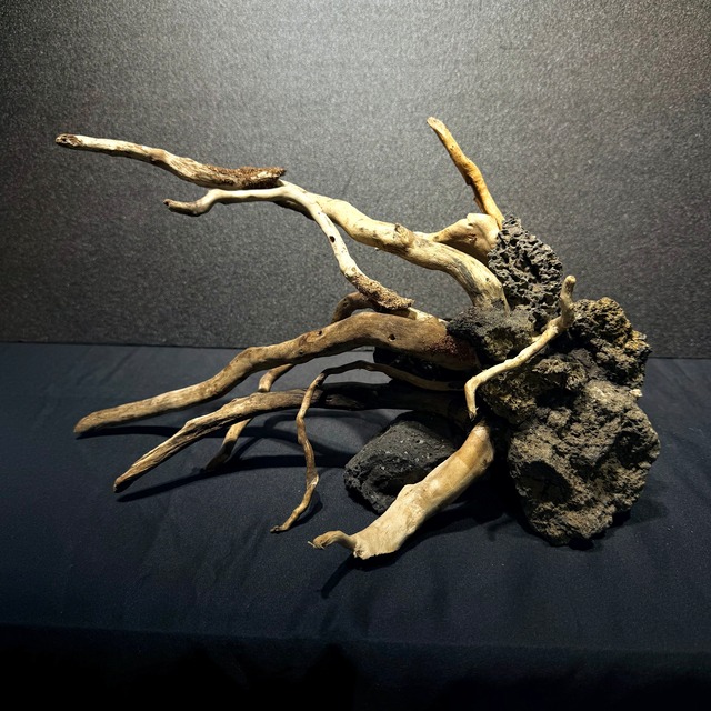商品名 一点物 石木景【No.015】 -------------------------------------------------------------------------------- 商品説明 溶岩石 × 枝流木 × 独自構造美 — 自然を映した一点物の水景作品。 「石木景(せきぼくけい)」は、溶岩石と枝流木をオリジナルの方法でしっかり固定・組み合わせた、一点物のレイアウト作品です。自然素材の形をそのまま活かしつつ、職人の手で立体的に仕上げているので、水槽に置くだけで奥行きと落ち着きのある景観が完成します。 多孔質の溶岩石はバクテリアのすみかにもなりやすく、流木にはモスや活着植物を取り付けて自由にアレンジOK。安定して自立する作りだから、水に入れてもぐらつかず、アクアリウム初心者でも気軽に本格レイアウトが楽しめます。 -------------------------------------------------------------------------------- サイズ(約) 幅43×奥行30.5×高さ26(cm) -------------------------------------------------------------------------------- 特徴 ●複数の溶岩石と枝状流木を組み合わせた完全一点物 ●独自の固定技術による高い安定性と美しい造形 ●苔・モス・活着植物のベースとしても最適 ●アクアリウムにそのまま設置可能 -------------------------------------------------------------------------------- ご注意 ※天然素材・手作業による一点物のため、形状やサイズに個体差があります。 ※使用前に軽く水洗いしてください。 ※天然素材・手作業による一点物のため、形状やサイズに個体差があります。 ※アク抜きはしていません。 ※沈まない場合があります。その場合は水へ沈めておいていただければ2~3日程で流木が水を吸い込み沈むようになります。 ※サイズおよびデザイン等のお客様都合による返品はお断りしております。 --------------------------------------------------------------------------------