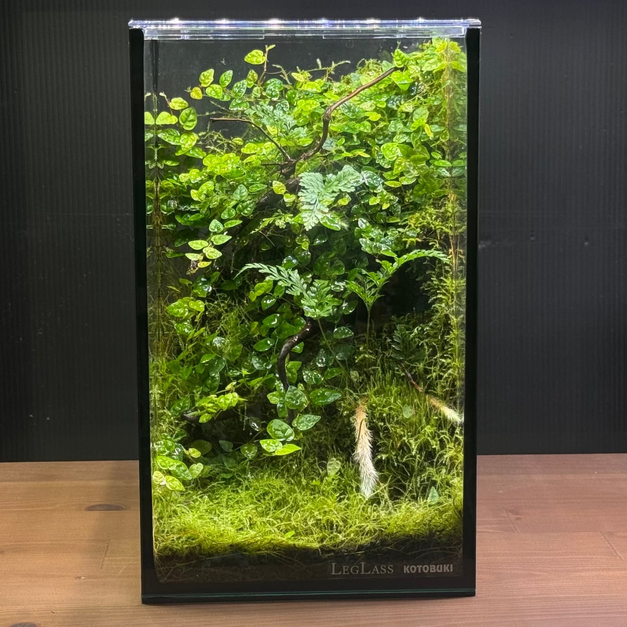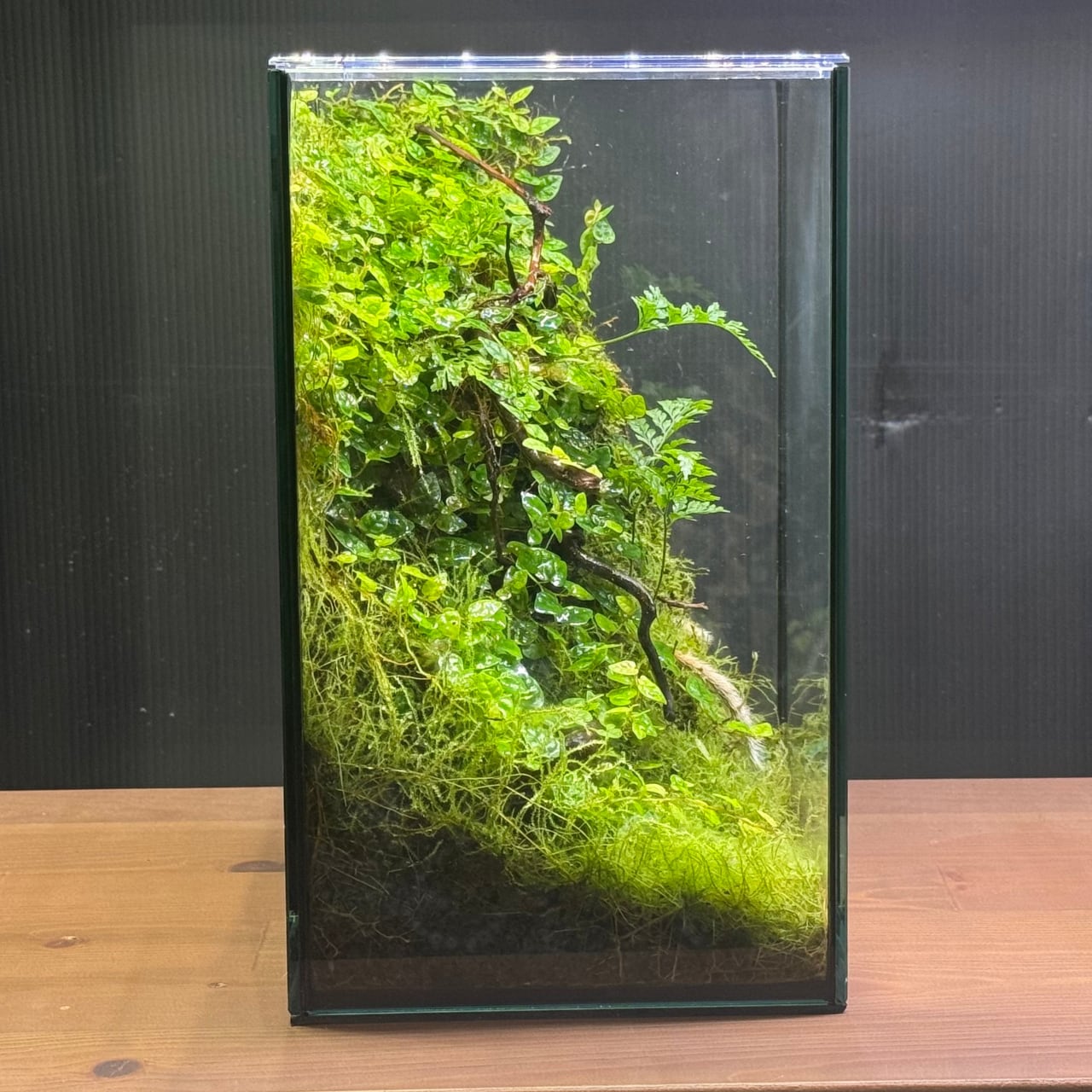 高さ25cmの縦型水槽を使い、流木や石、植物などをバランスよく配置しており、届いたその日からインテリアとしてお楽しみいただけます。