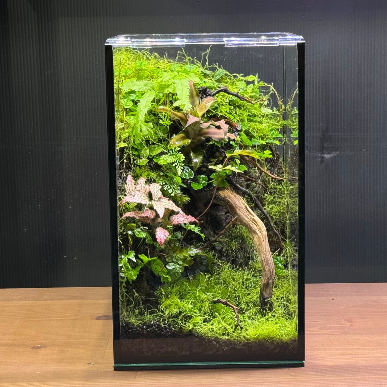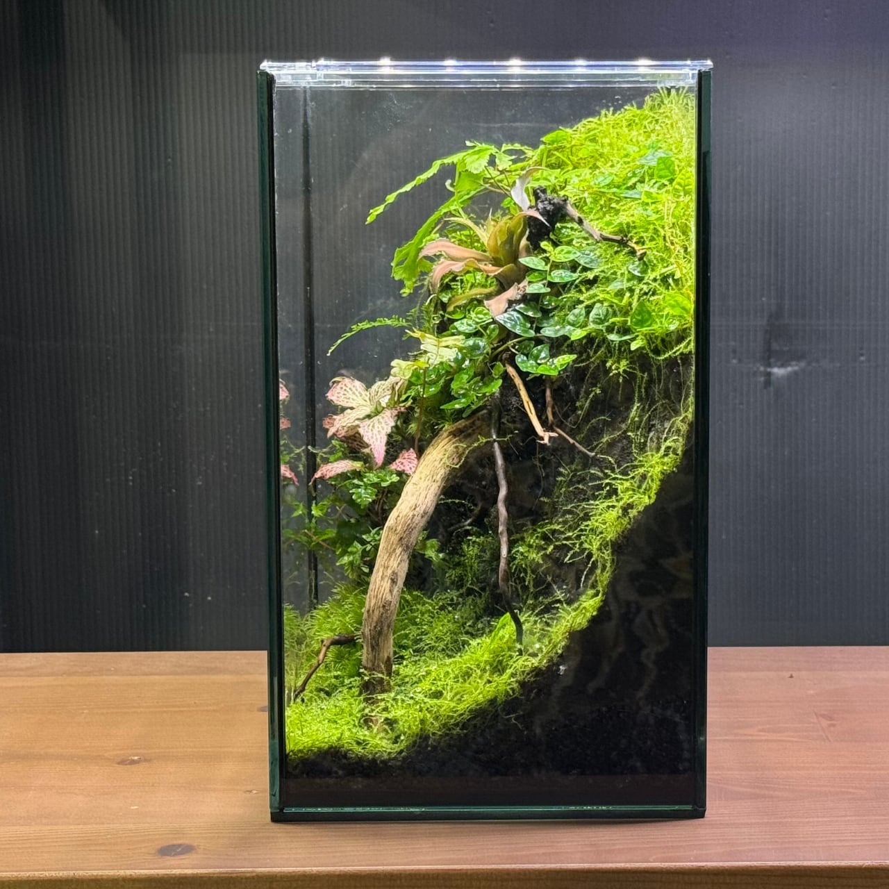 高さ25cmの縦型水槽を使い、流木や石、植物などをバランスよく配置しており、届いたその日からインテリアとしてお楽しみいただけます。