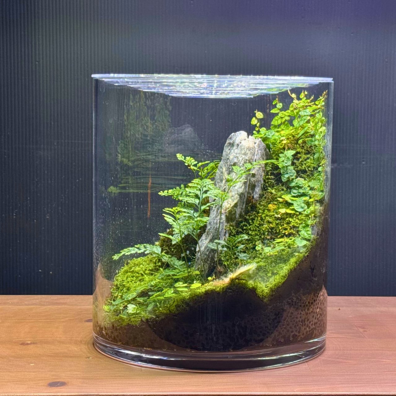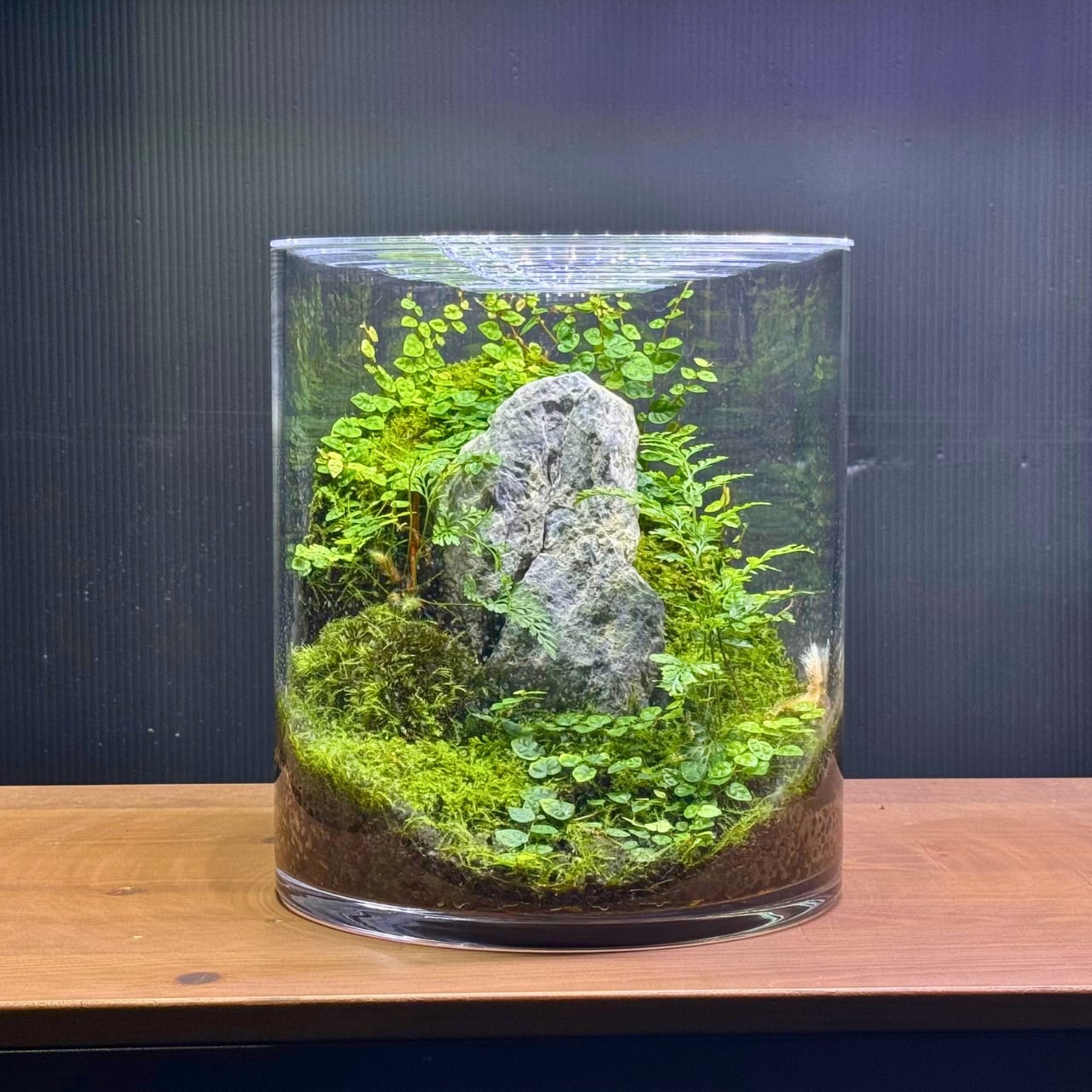 高さ20cmの円柱水槽を使い、流木や石、植物などをバランスよく配置しており、届いたその日からインテリアとしてお楽しみいただけます。