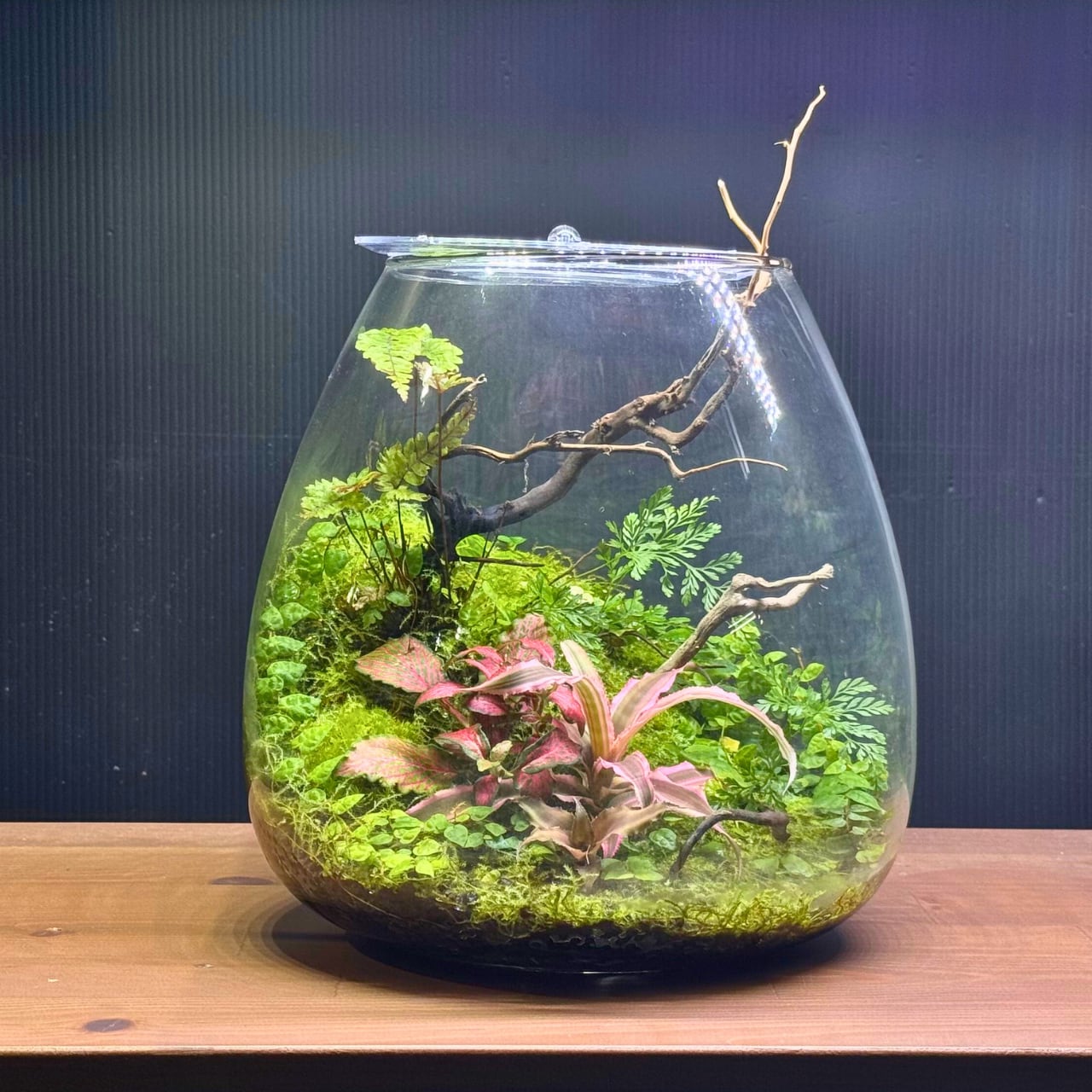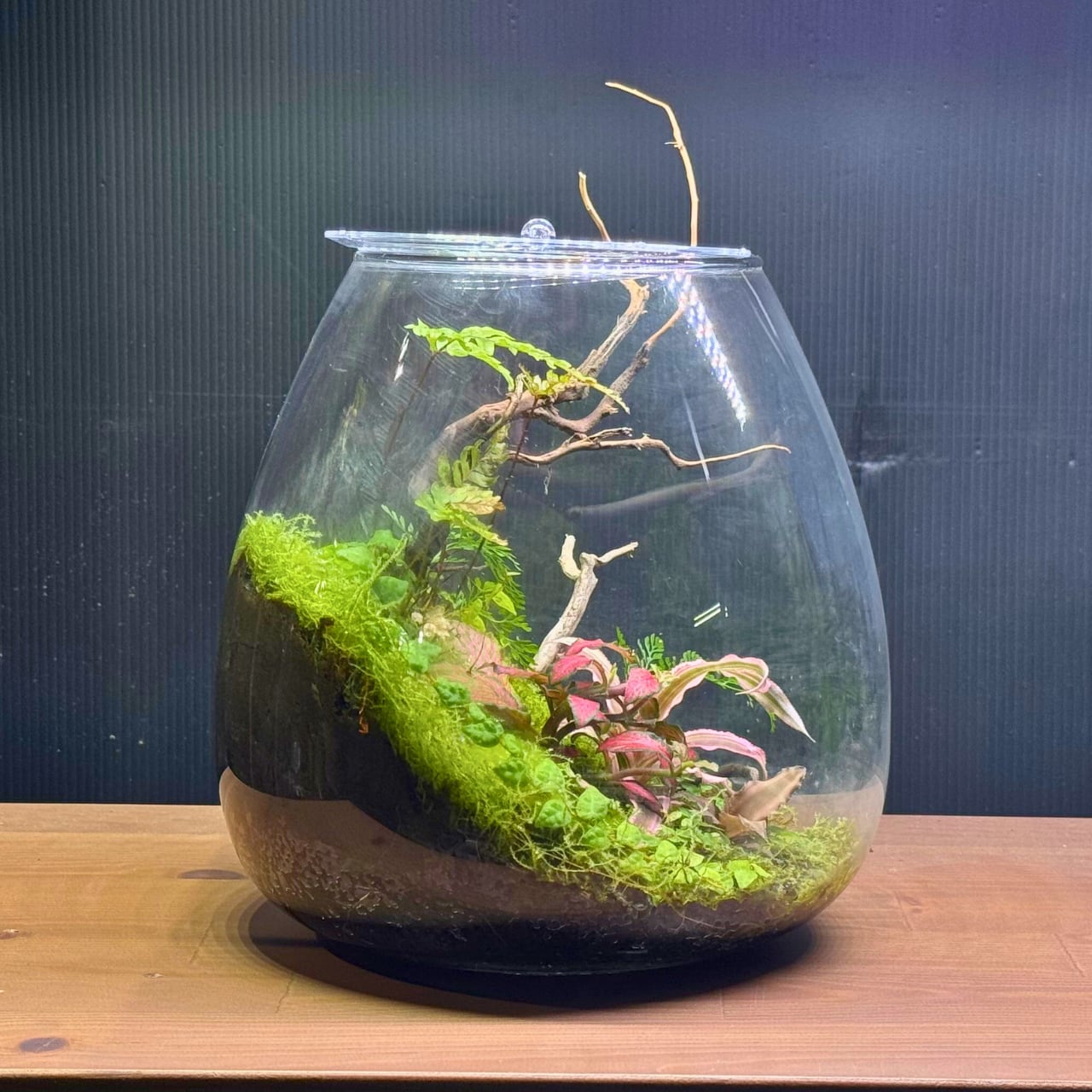 高さ20cmのしずく型水槽を使い、流木や石、植物などをバランスよく配置しており、届いたその日からインテリアとしてお楽しみいただけます。