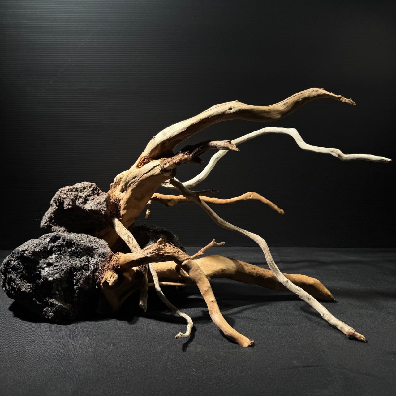 複数の溶岩石と枝状流木を組み合わせた完全一点物